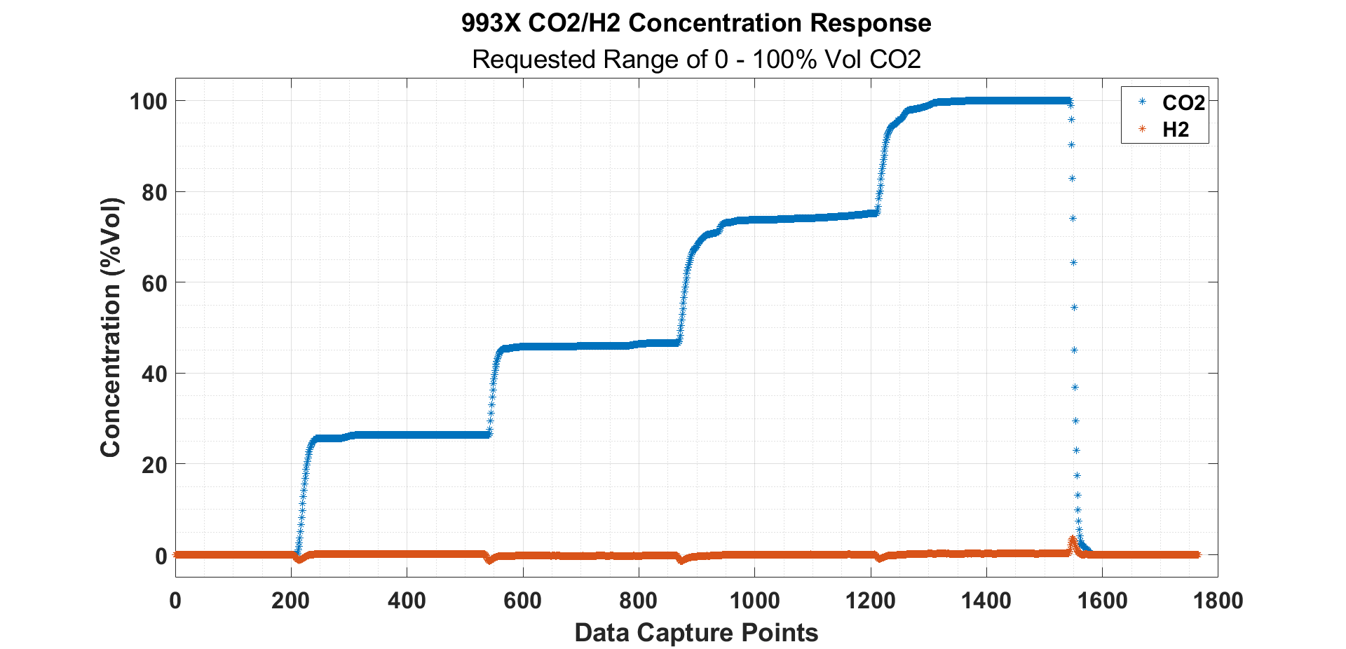 CO2 and H2 Gas Concentrations during factory validation testing. Analyzer H2 response remains stable close to 0% across 0 – 100% Vol CO2 variation.